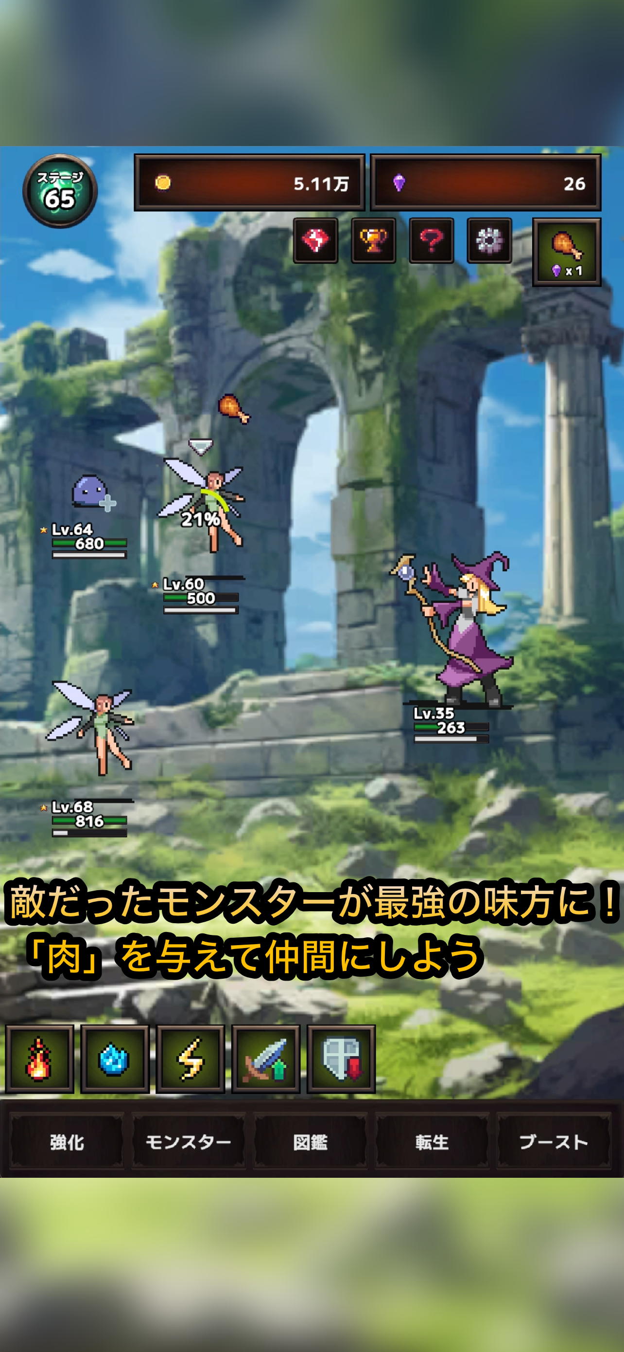 敵モンスターに「肉」を与えることで仲間にできる画期的なシステム!スライム、ドラゴン、エンジェル、マーメイドなど100種類以上の多彩なモンスターが仲間になります。集めたモンスターはドット絵で描かれた愛らしい姿で、コレクションする楽しさも格別です。同じモンスターを再度仲間にすることでパワーアップし、成長ボーナスやスキルレベルが向上します。