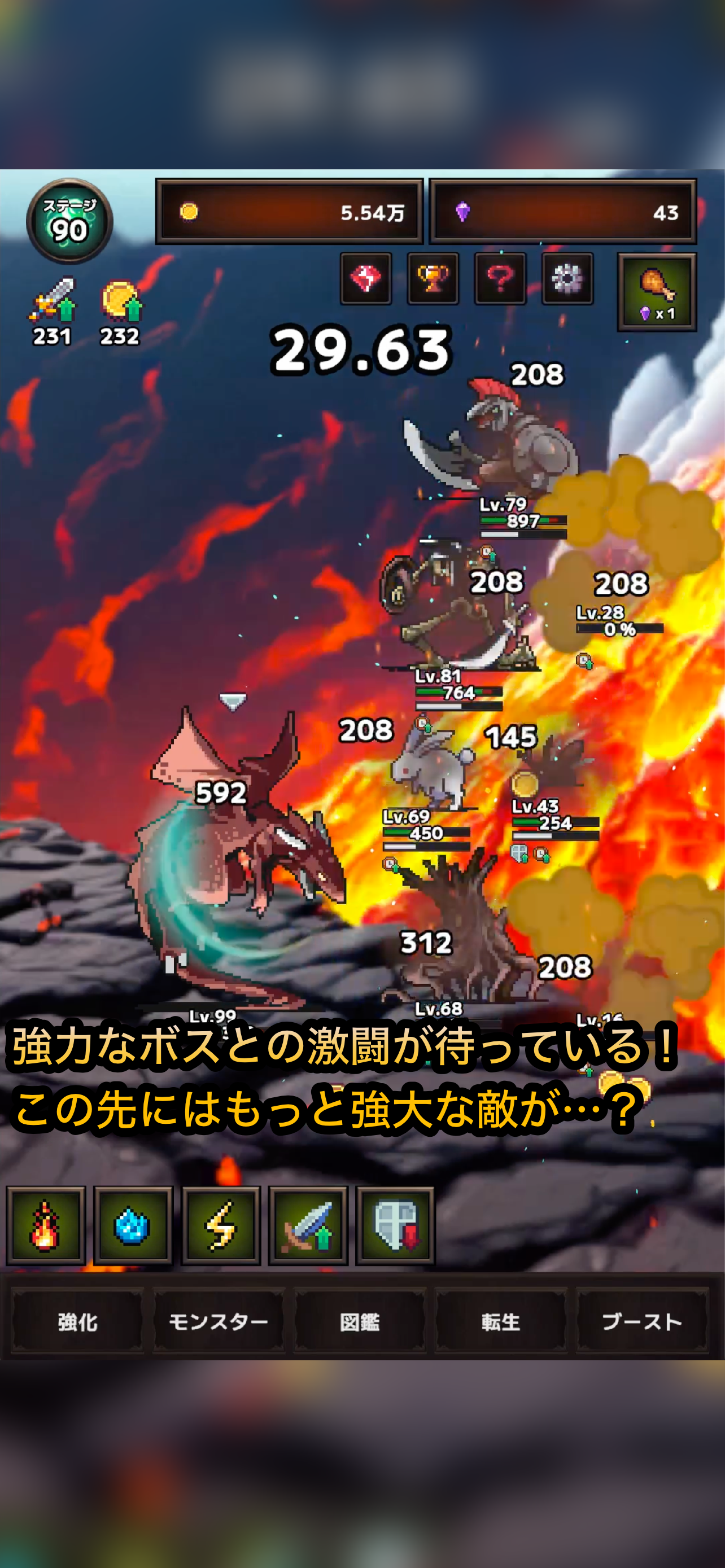 進行が困難になったら転生のタイミング!すべてをリセットして新たなスタートを切ることで、プレイヤーの攻撃力が永続的にアップ。仲間になったモンスターのスキルレベルや成長ボーナスは引き継がれるため、転生するたびにより強力になって異世界での冒険を再開できます。