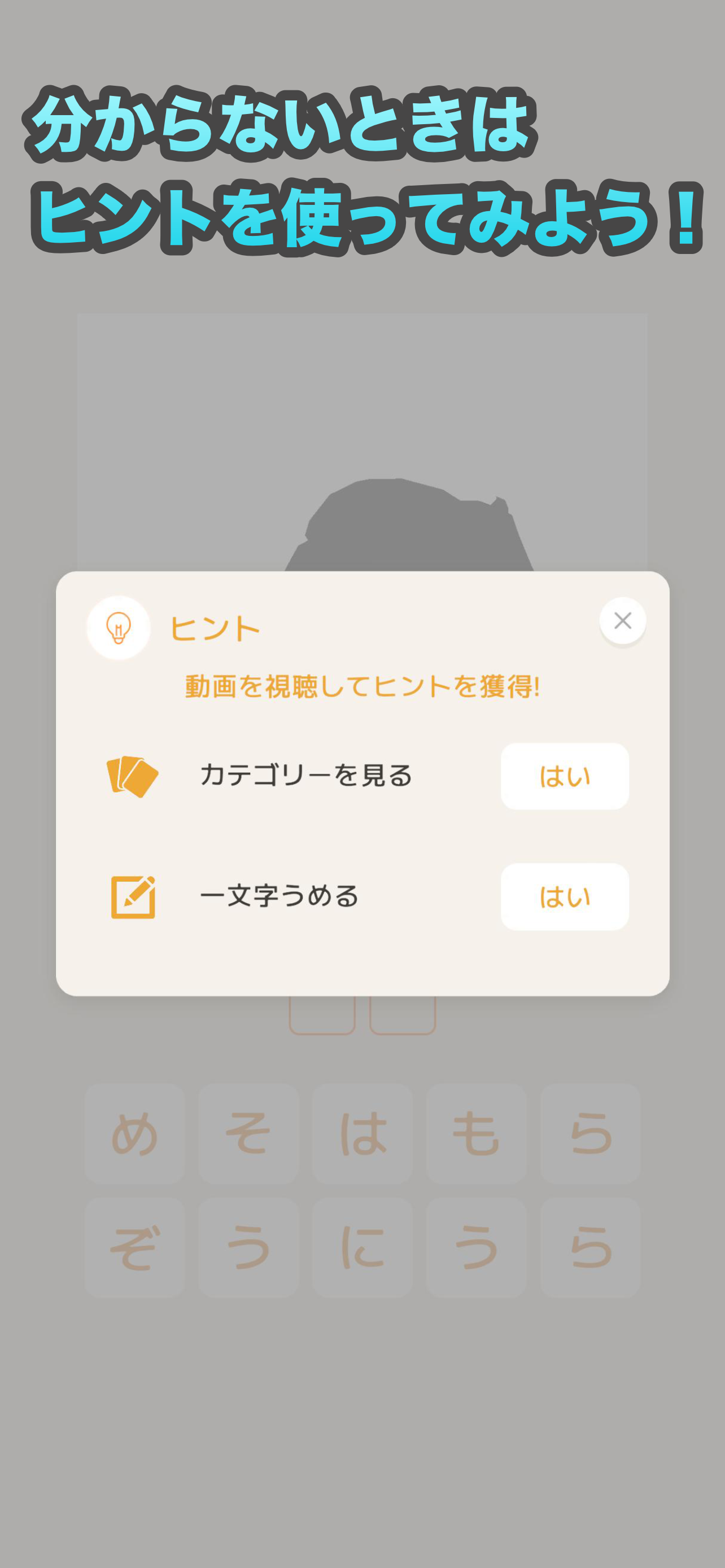 クイズの答えが分かったら、下の文字リストから、ひらがなを一文字ずつ入力。
